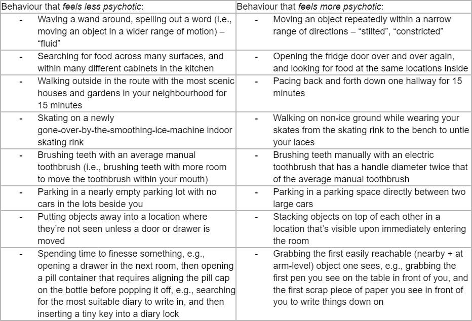 Here are some descriptions for movements that I personally think feel less indicative of psychosis to me vs. feels more indicative of psychosis of me — i.e., psychomotor signs visible to the person experiencing them, that others can potentially notice as well: