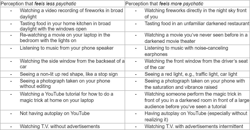During my first episode of psychosis, I didn’t experience any hallucinations — only delusions. Nonetheless, the episode did include differences from my usual sensory experiences. These are analogies suggesting what the having of perceptual symptoms feels like to me, in case this would help one recognize them in oneself: